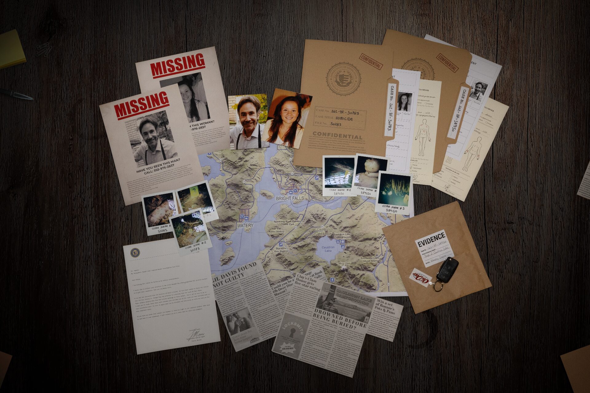 Inside the introduction box though was also a compartment with an unhinged cult member – a ‘Secret Admirer’ – and evidence linking Rookies to an online video, to show them there was more to this case that met the eye… Shortly after, Rookies received Kit 2 featuring two case files with supervisor letter for direction, a map of Bright Falls and evidence including police and autopsy reports, polaroids of the victims and crime scenes, missing posters, newspaper reports and a car fob.
