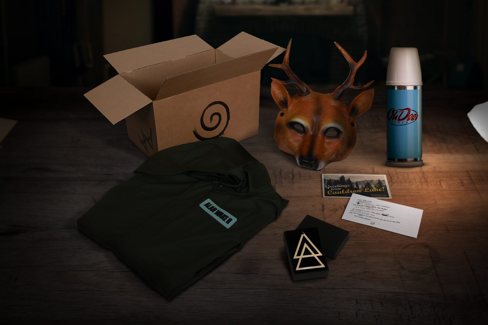 Inside Kit 4 were an Alan Wake II-branded Rains Fishtail Parka, a life-sized deer mask, an Oh Deer Diner thermos, a Cult of the Tree necklace and an unhinged postcard from the Secret Admirer – all in a special cult-design printed box. TAKEOFF handled design and narrative direction of each kit, production of case files and content, creation of kit clues, goodies, digital content, packaging and distribution.