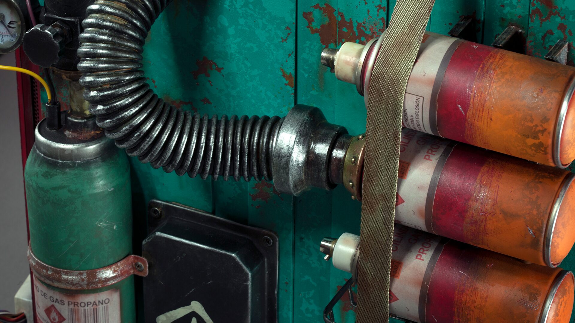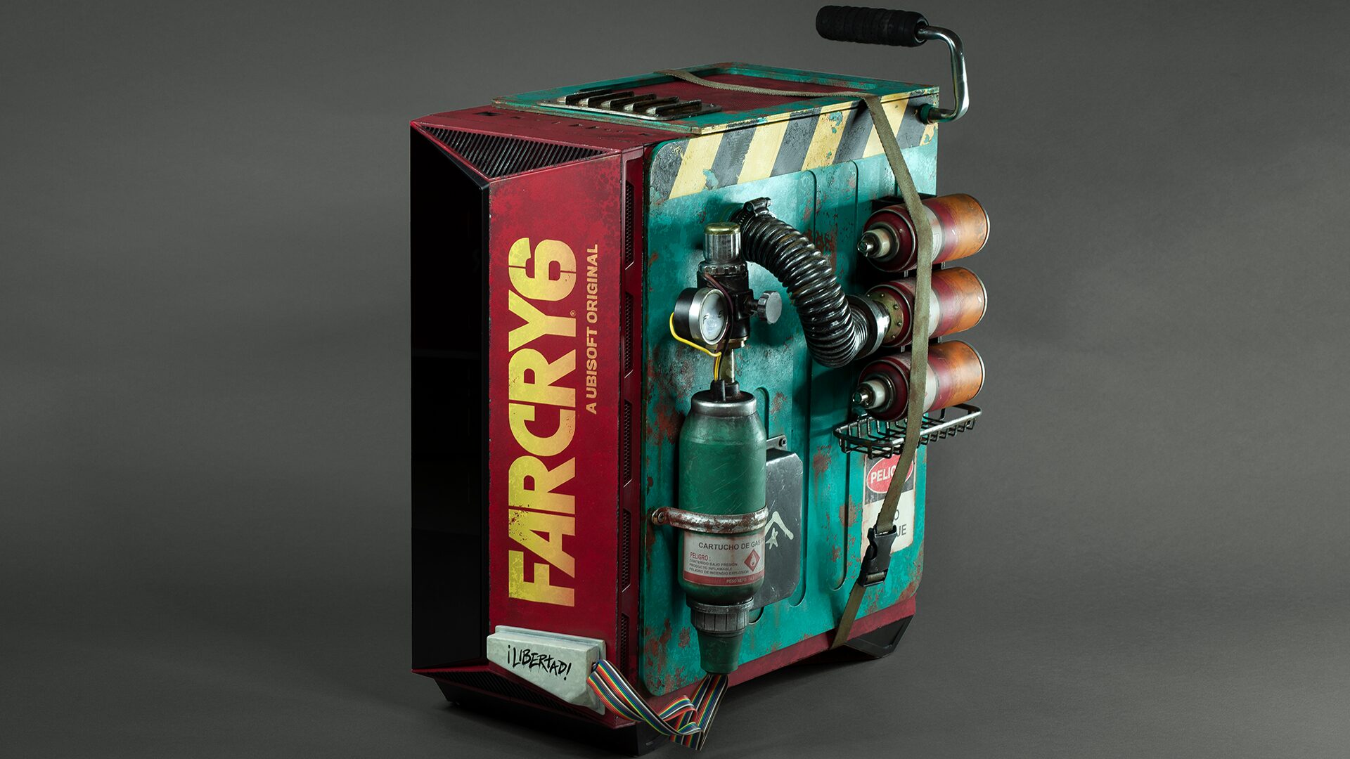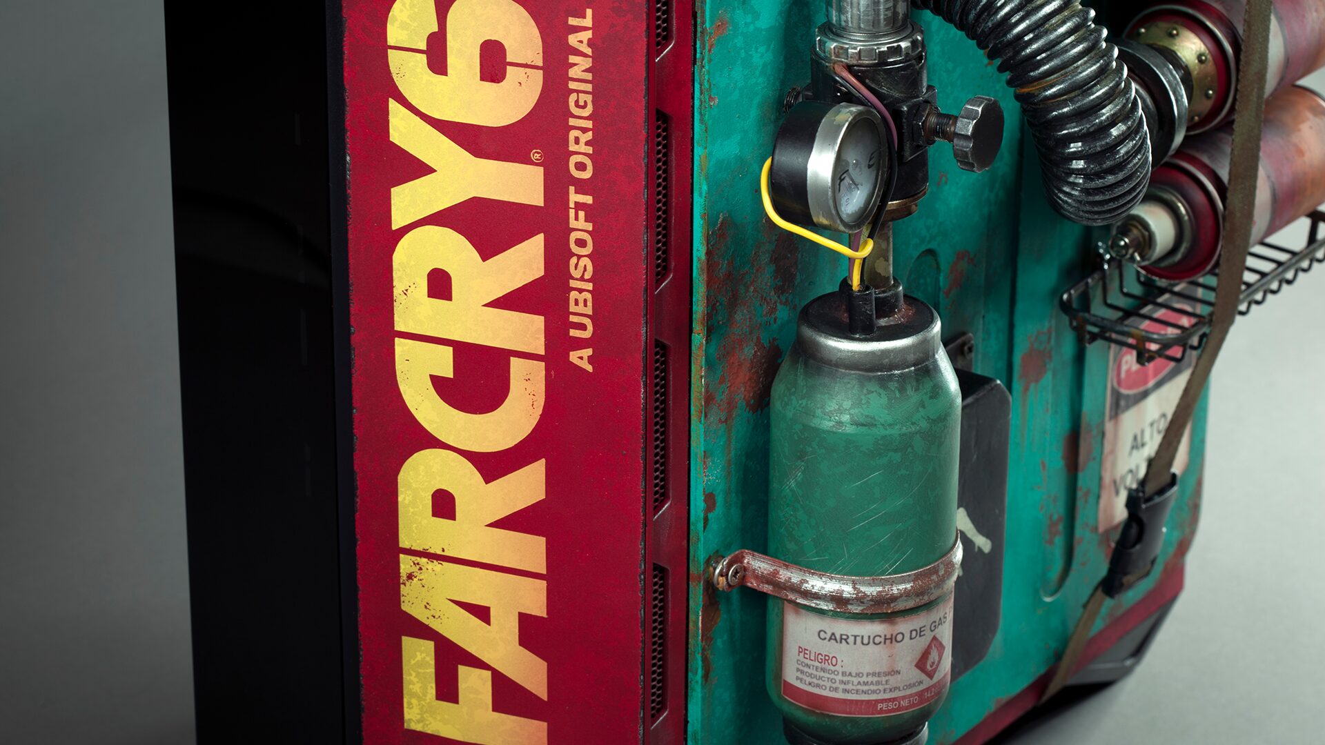 (Faux) explosive gas canisters and a flammable cylinder, complete with pressure gauge, were strapped onto one side of our PC, complemented by wires and pipes connecting all elements to the ‘electric generator’ panel. Our skin also features guerrilla graffiti, Far Cry 6’s colours and branding, a glass side panel with ‘flammable’ logo and carry handle.