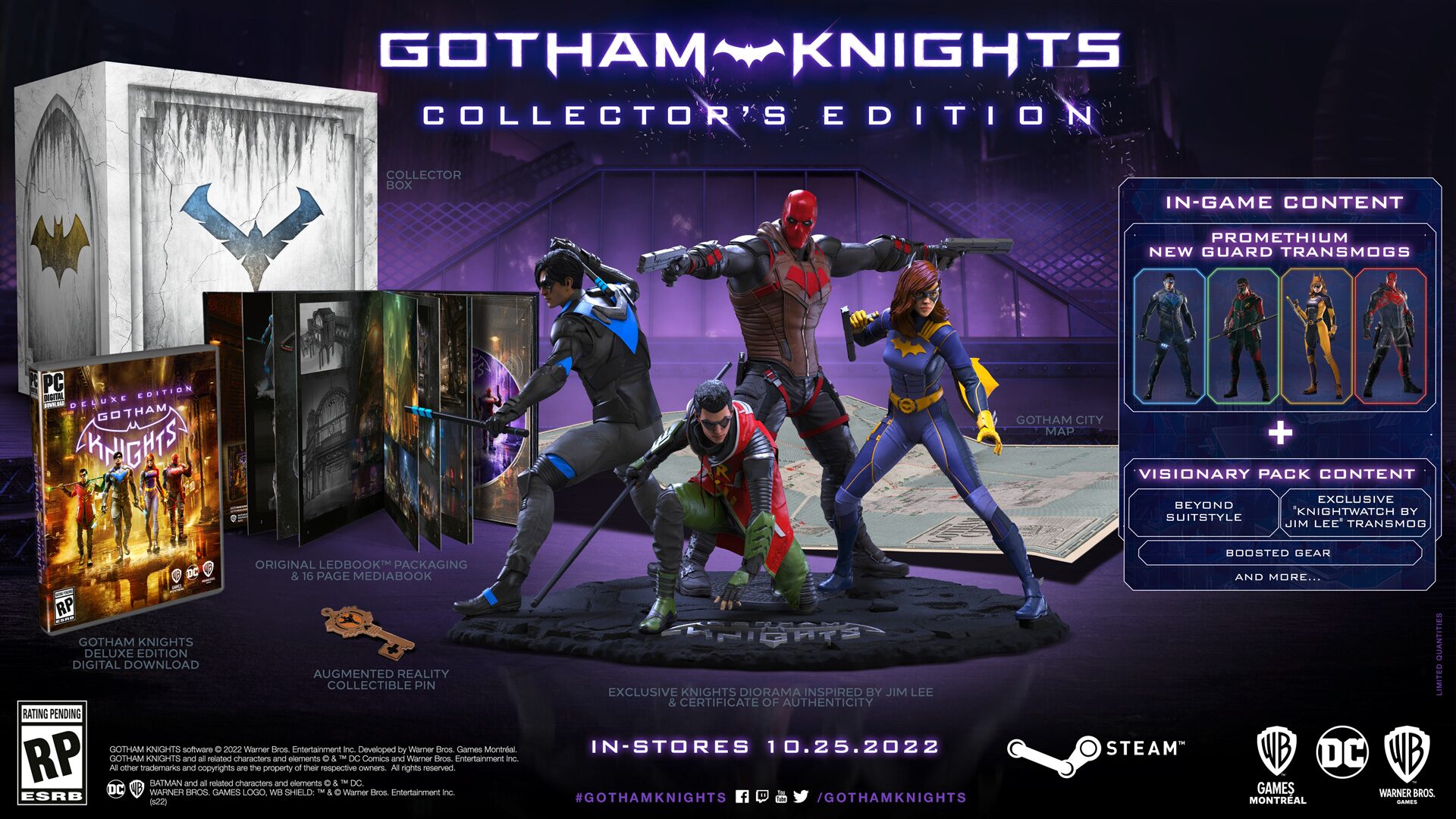 Warner Bros. asked us to create exclusive Gotham Knights Collector’s Editions for PS5, Xbox Series S/X and PC versions of the game, filled to the brim with Bat-themed physical and digital goodies that fans of the franchise would love.