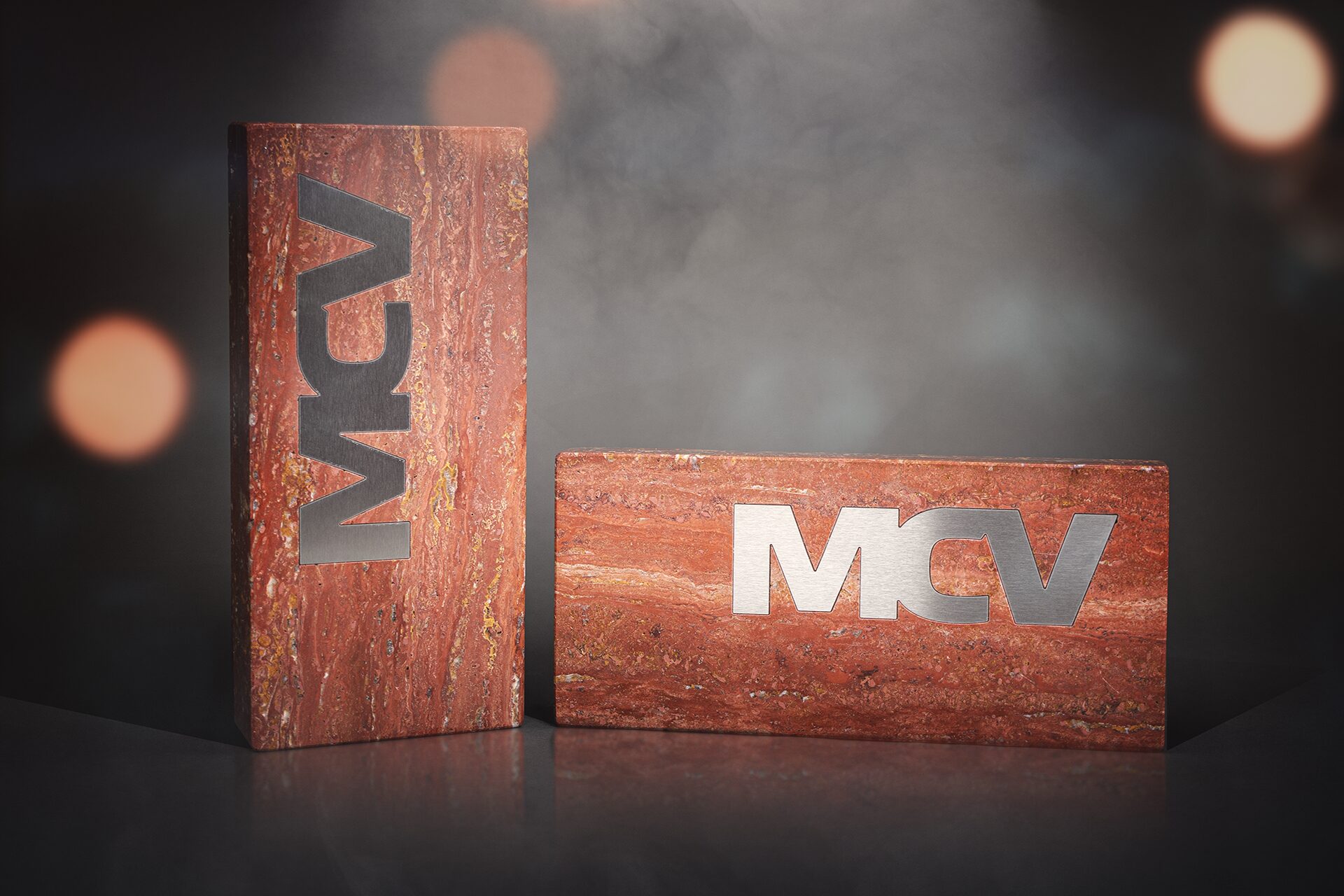 Our 23 trophies were created from a red marble from Spain called Rosso Alicante, which was specially cut to shape by water jet. They were very heavy to emphasise quality and finished by hand, with experienced artists branding them with brushed-aluminium MCV logos. We have also created branded packaging for the trophies to be handled in.