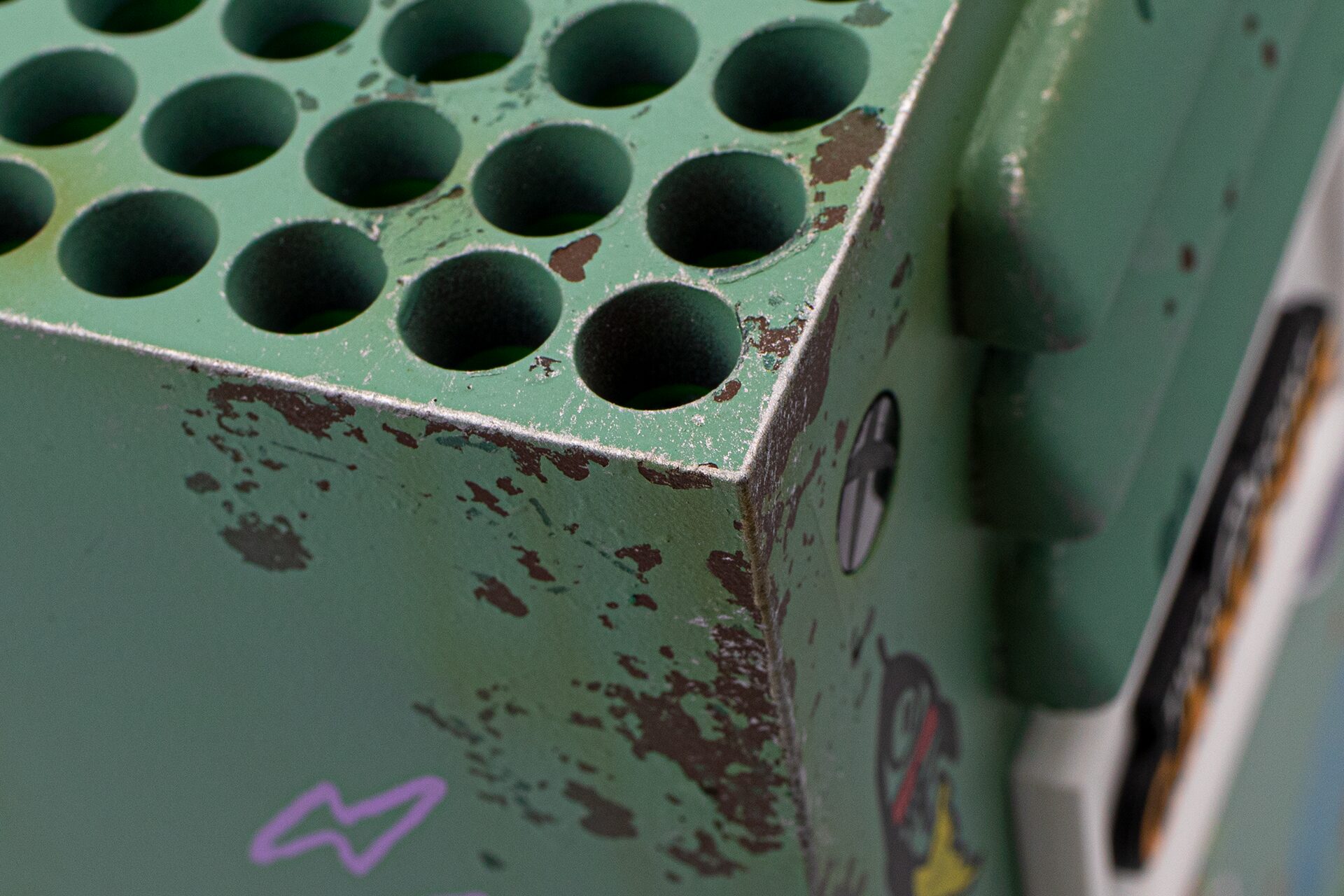 To show off our school spirit, we crafted a custom Xbox Series X console that looked like a much-loved locker. The tower was painted green and given locker vent features, and was covered with fun Two Point Campus-themed class stickers, marker-style graffiti and notes. The console was finished with a 3D ‘Two Point Campus’ crest; the controller included the same colouring and themes.